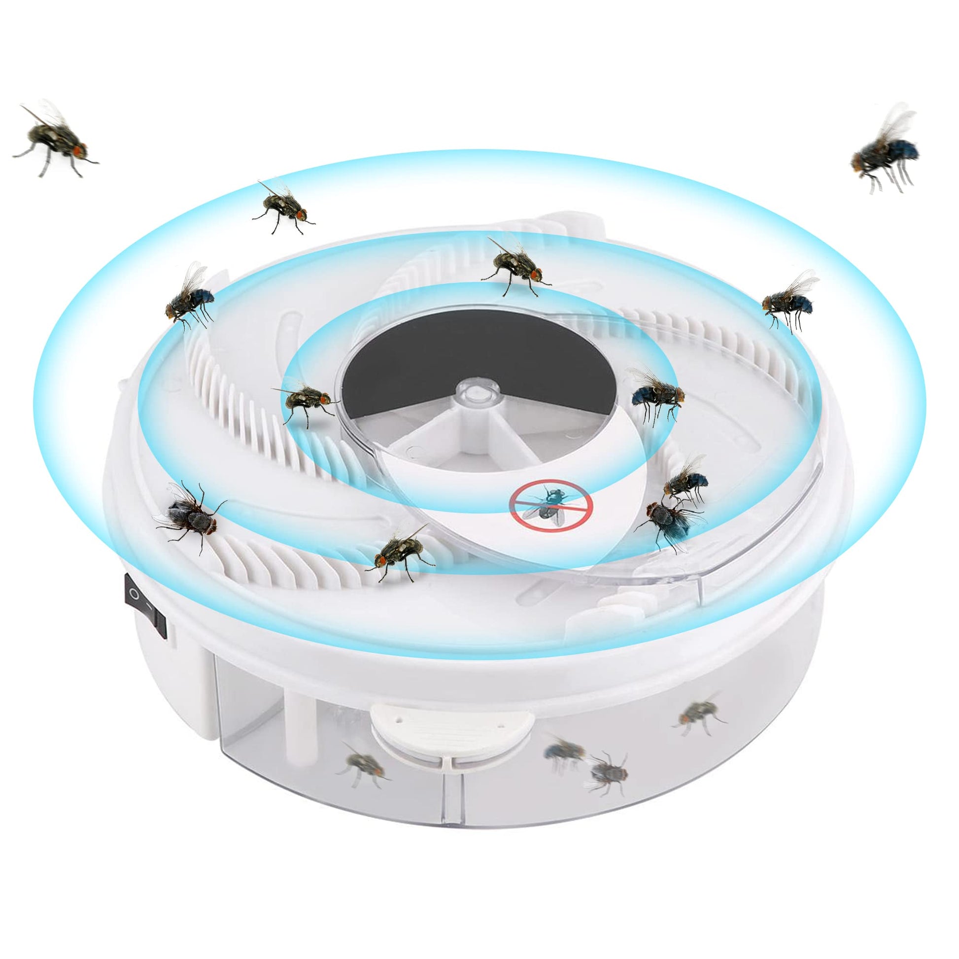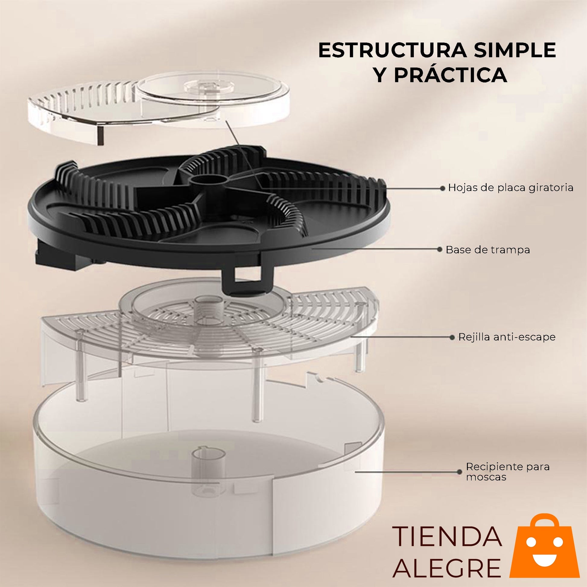 3. Captura de Moscas: Las moscas son atraídas al cebo y luego transferidas a la caja por la placa giratoria.